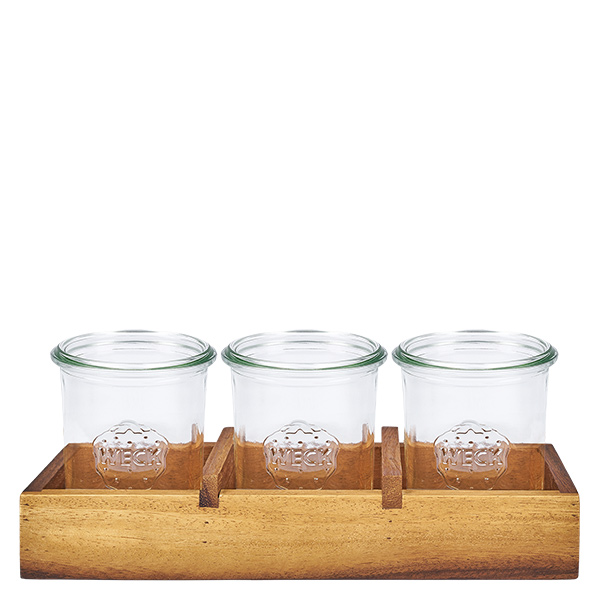 La boîte à plateau de service de qualité supérieure est en bois d'acacia et comporte 3 compartiments hauts. Elle assure un aspect agréable et élégant à votre table de repas. Servez-y par exemple 3 dips différents ou des desserts dans un verre WECK.