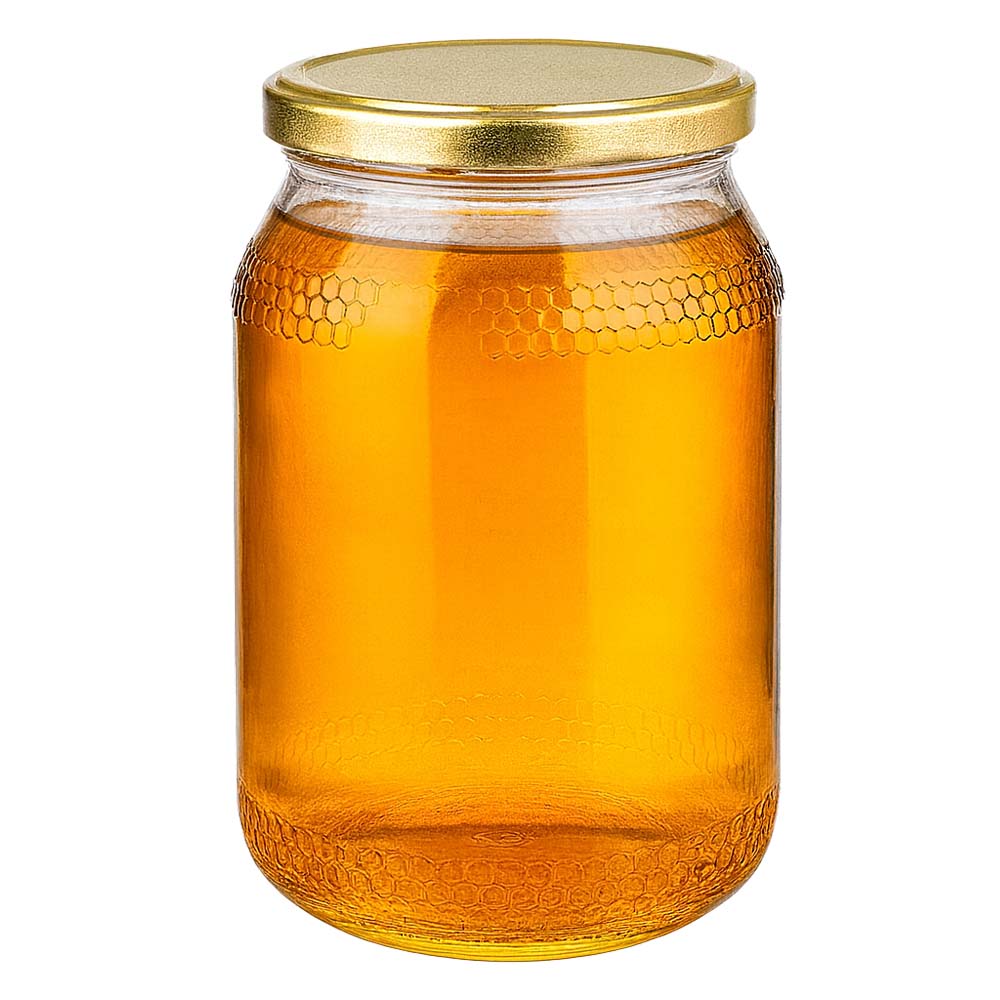 Pot à miel en verre de 1260 g avec couvercle doré BasicSeal UNiTWIST. Parfait pour les grandes quantités de miel, les formats familiaux et les présentations de qualité premium.