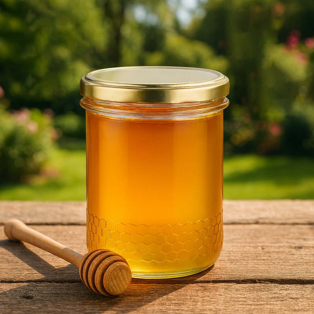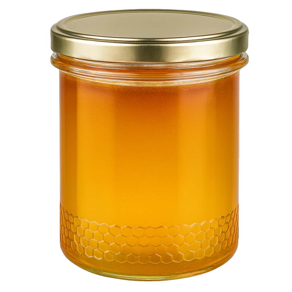 Pot à miel en verre de 560 g avec couvercle métallique doré BasicSeal UNiTWIST. Une solution élégante et robuste pour la vente de miel, les cadeaux et les présentations de qualité.