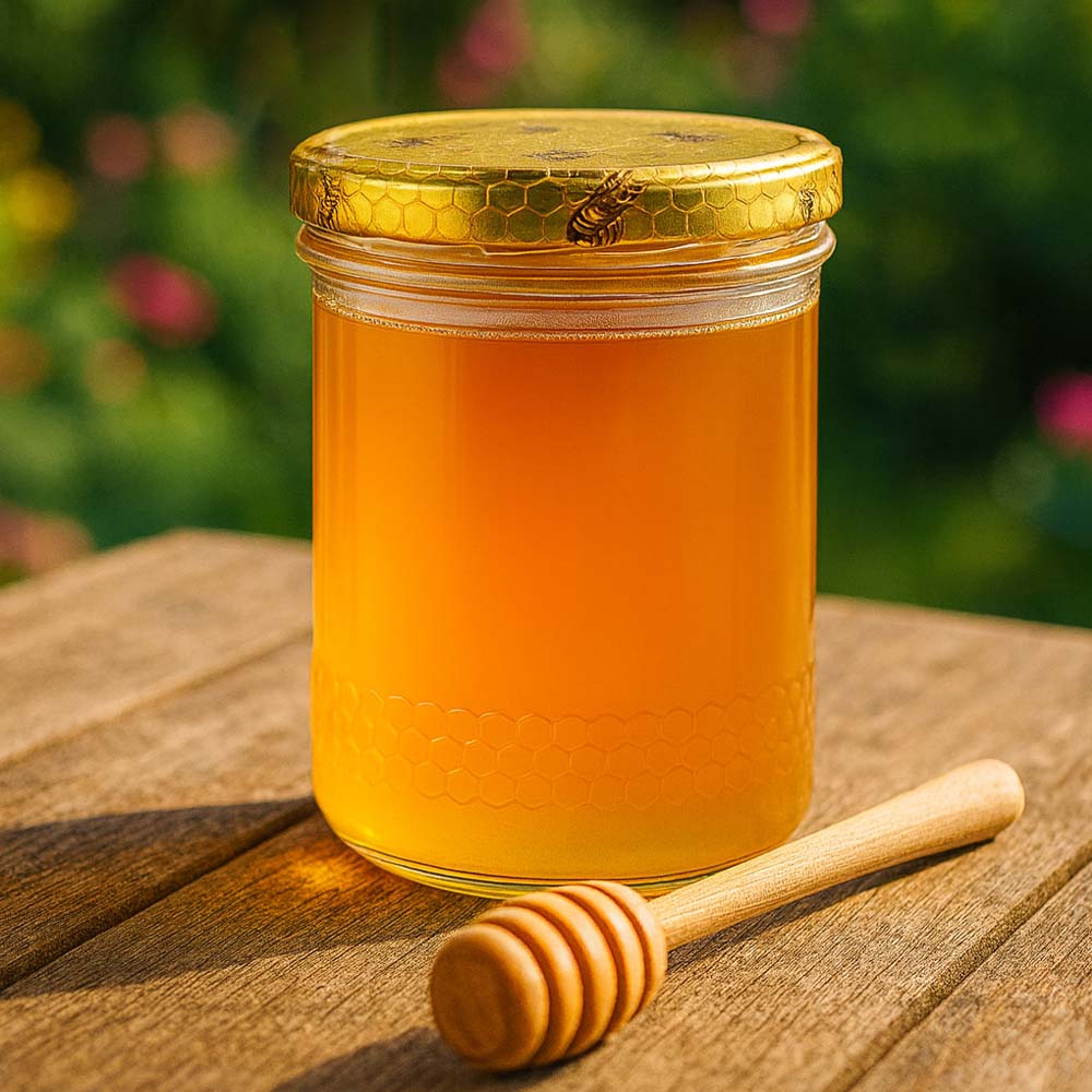 Pot à miel en verre de 560 g avec couvercle métallique orné d’un motif rayon de miel BasicSeal UNiTWIST. Le design alvéolé met en valeur l’authenticité du miel et convient aux ventes directes ou aux coffrets cadeaux.